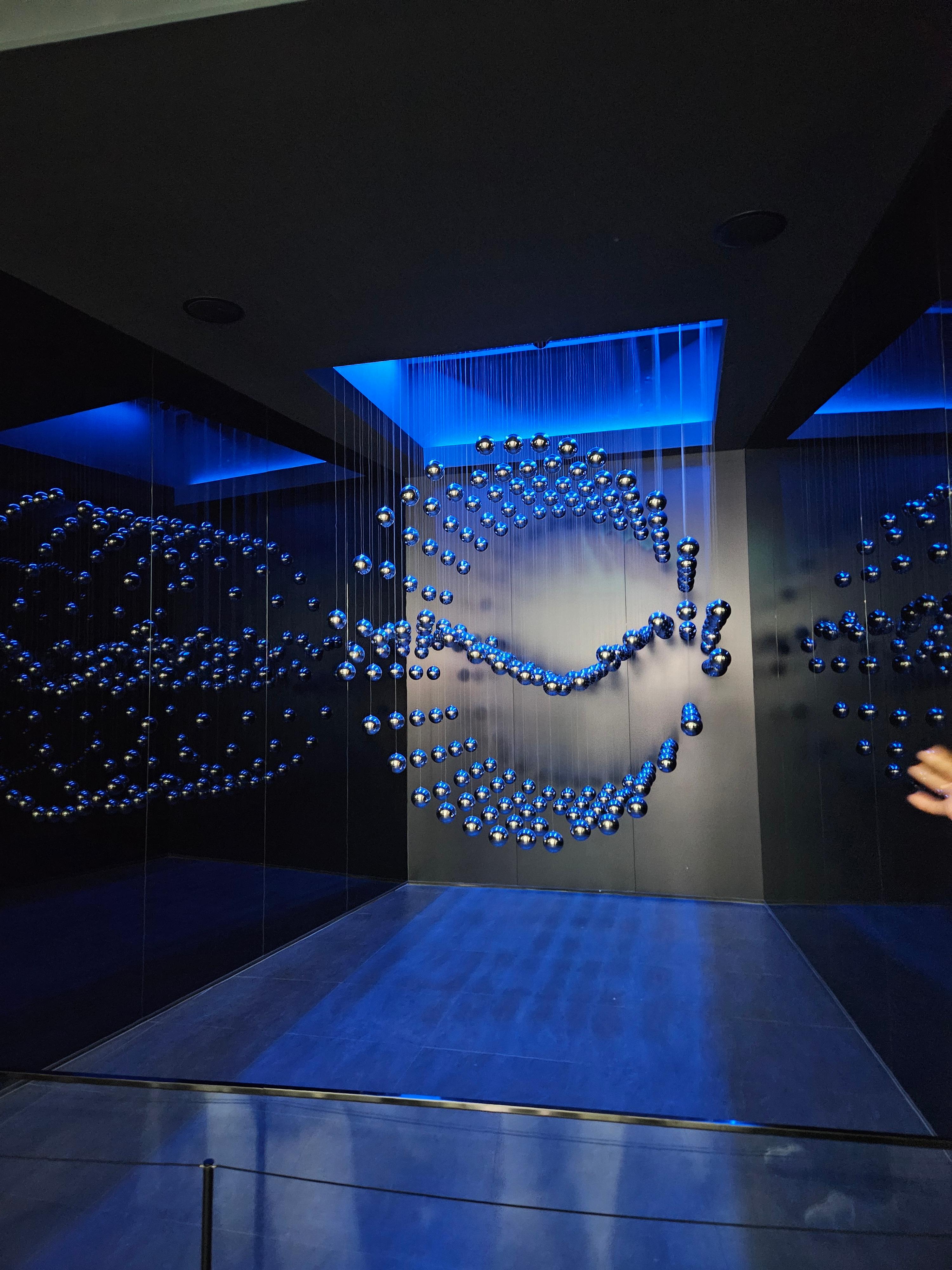 1층에 있는 현대미술품으로 구슬이 배열을 변경하면서 태극, 國, 民 등의 문자를 만들어 냅니다.