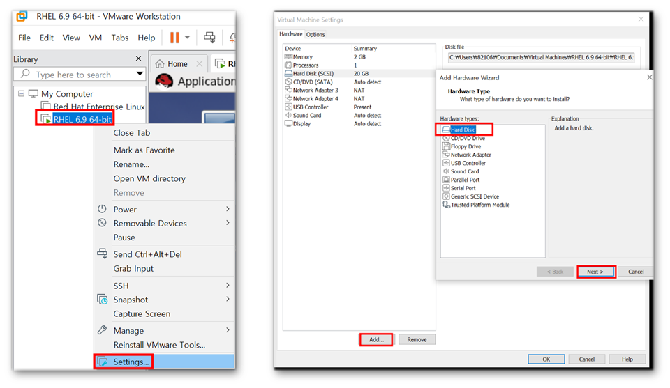 Add.. 버튼을 클릭한 후 Hard Disk를 선택하고 Netx 버튼을 클릭합니다.