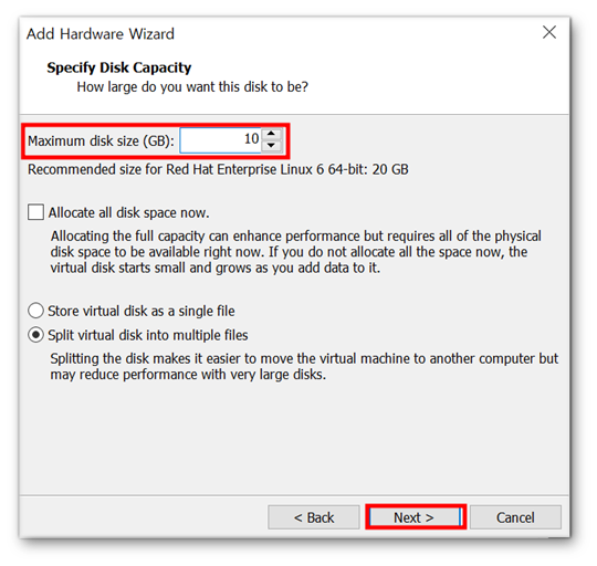 가상 머신의 디스크 용량을 설정하고 디스크를 여러 가상 디스크( . vmdk)파일로 분할할지 여부를 지정합니다.